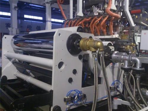 在討論共擠出之前應對單層流延薄膜和片(piàn)材作些(xiē)說明。片材(cái)和(hé)薄膜之間的區別(bié)是沒有定論的,但薄膜通常被看作厚度低於250μm(10密耳)。用於流(liú)延薄膜和片材的(de)擠出設備非常類似(sì)。在一係(xì)列(liè)輥筒組方麵(miàn)經常存在著差異。流延薄膜體係(xì)從模頭擠出到流延(yán)輥筒最常用的是垂直向下,然後到一係列水平輥筒組。這種幾何排布避免了薄膜在模頭和一係列(liè)輥筒組的輥隙之間過分熔(róng)垂,如果薄膜擠出采用水平的模頭出口就可能發生熔(róng)垂。