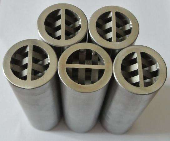 在共擠出裝置中使用(yòng)靜(jìng)態混合器有好處,因為從擠出機到供料頭有長的轉(zhuǎn)移線(xiàn)路,而(ér)長轉移線路會造成熔(róng)體溫(wēn)度不均勻。這些不一致會因管道內拋物線速度分布,壁溫和熔體溫度(dù)不一致而增大,造成聚合(hé)物增大了的滯留時間發生變化,所受到的剪切改變,以及加熱或冷卻的效果不一致。采取的彌補措施是在轉移線路的終端,即就在熔體進入供料(liào)頭的前(qián)邊放入一個靜態混合器,這是一個分配混合裝置,以再次均化熔體。如(rú)果聚合物相(xiàng)容得足夠好,那麽高剪切合(hé)能保證在這兩相或多相混合(hé)物中物質(zhì)性能均勻一致。當在回收料中有像EVOH那樣難於(yú)分散的聚合物時更是(shì)這樣(yàng)。對這些類型的回收料需要特別設計(jì)混合螺杆。