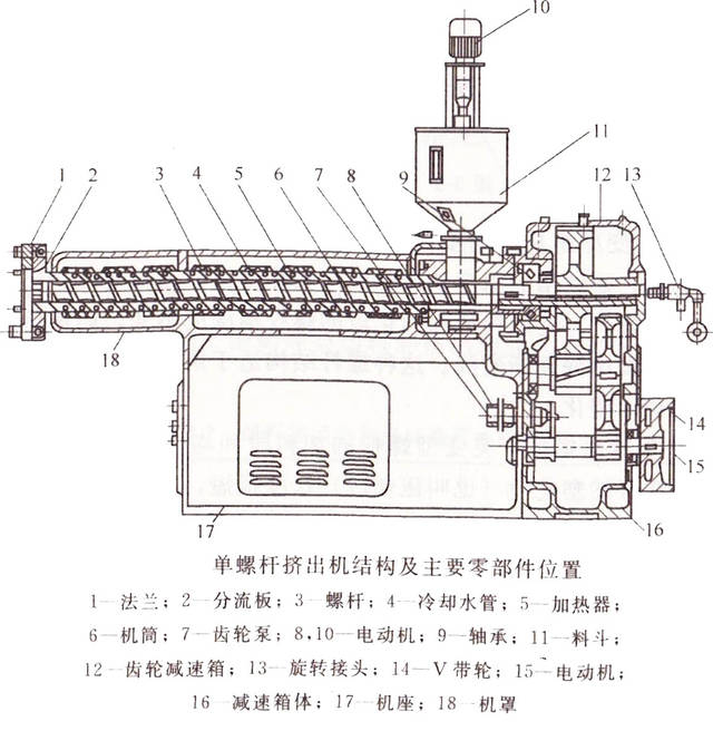 1-連接模具(jù)法(fǎ)蘭 2-分流板 3-螺杆 4-冷卻水(shuǐ)管(guǎn) 5-加熱器6-機筒 7-齒(chǐ)輪泵 8、10-電動機 9-滾柱軸承 11-進料鬥12-齒輪減速器(qì) 13-旋轉接頭 14-V帶輪 15-主電動機16-減速器體 17-機體 18-安全防(fáng)護罩(zhào)