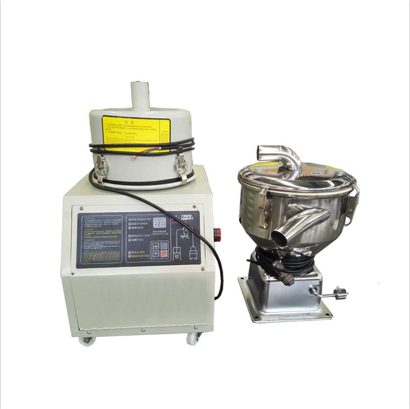 主要由風機、吸氣管、儲料倉、吸料管、過濾網、電控(kòng)箱等零(líng)部件組成。當料(liào)鬥需要上料時,風(fēng)機起動,通過(guò)吸氣管和過濾網,使中間儲料倉內形成(chéng)負壓;與此同時,與中間儲料(liào)倉及原料儲箱(xiāng)相連接(jiē)的吸料管8把原料儲箱中的原料吸人中間儲料倉(cāng)內,當吸入一定量時,上料繼電器動作,風機(jī)停止工作,吸料工作停止,這時(shí)排料活門打開,為擠出機料鬥供料。