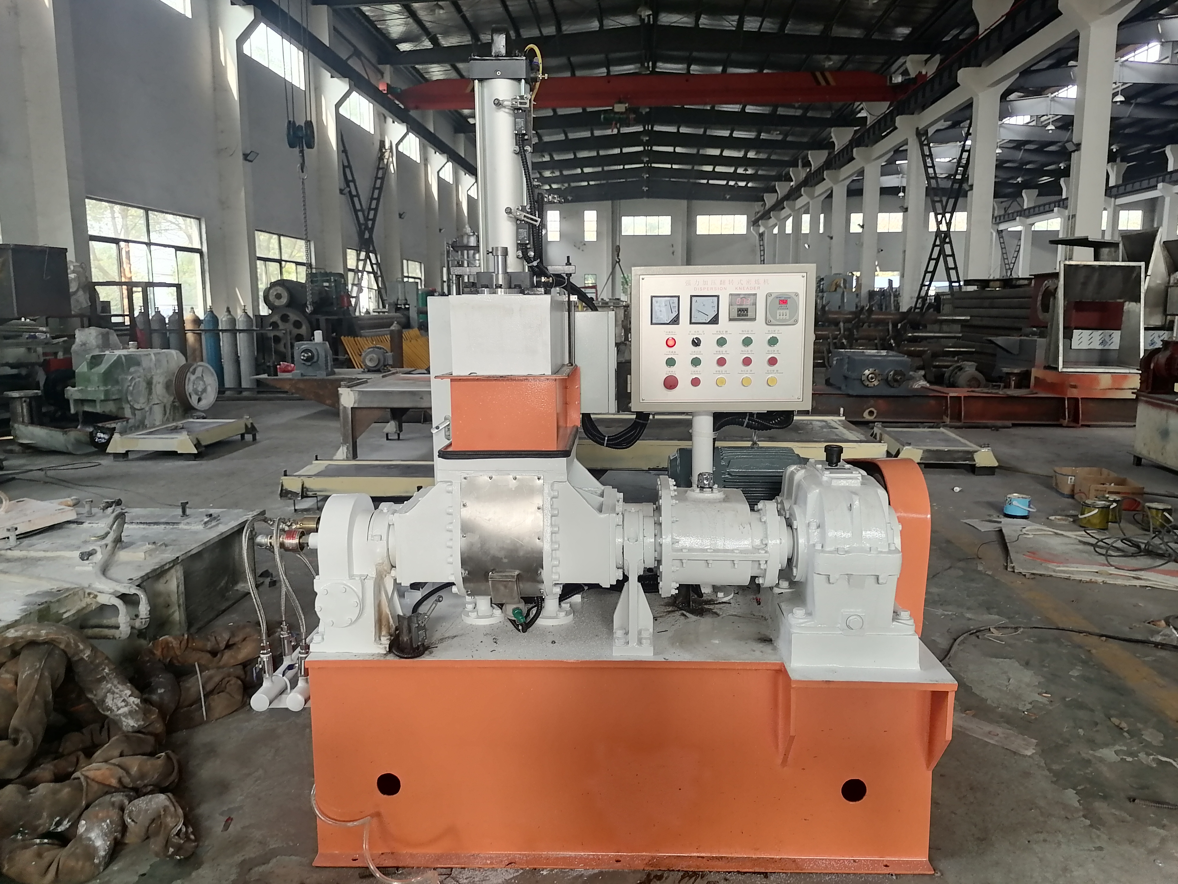 密閉式煉膠機簡稱密煉機,主(zhǔ)要用於橡膠的塑煉和混煉(liàn)。密煉(liàn)機是一種設有(yǒu)一對特定形(xíng)狀並相對回轉的轉子、在可調(diào)溫(wēn)度和壓力的密閉狀(zhuàng)態下(xià)間隙性地對聚合物材料進(jìn)行塑煉和混煉的機械,主要由密(mì)煉室、轉子(zǐ)、轉子密封裝置、加料壓料裝置、卸料裝置(zhì)、傳動裝置及機座(zuò)等部(bù)分組成。